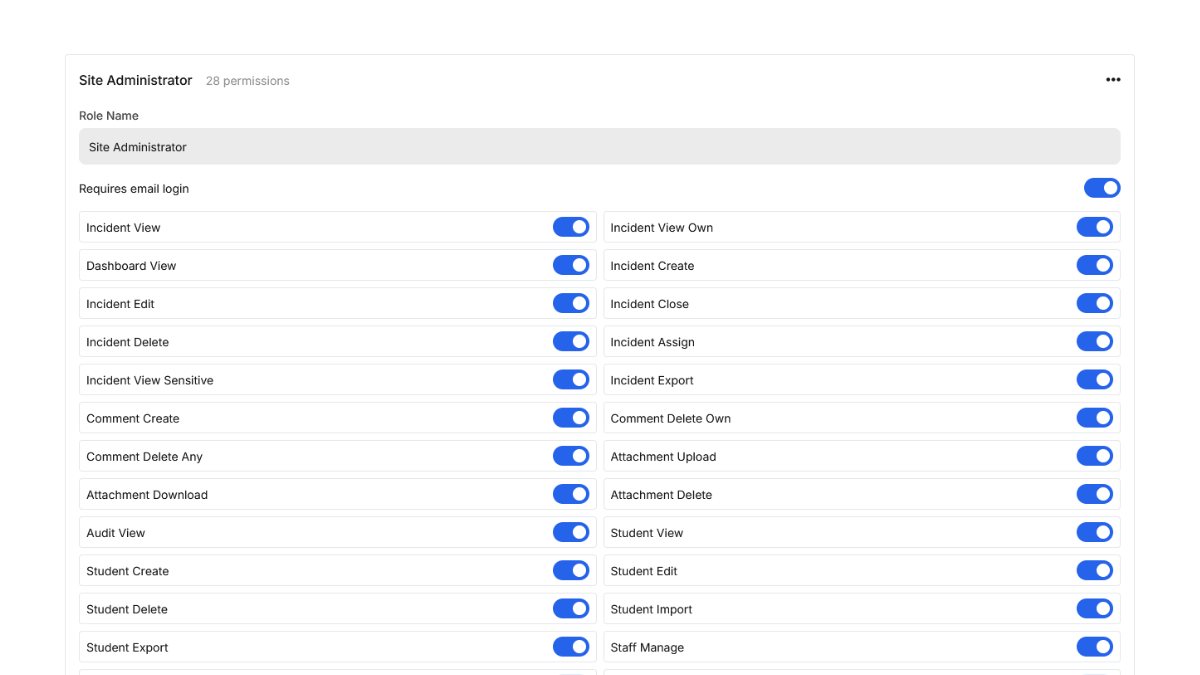 <table><thead><tr><th width="243">Name of Permission</th><th>Description</th></tr></thead><tbody><tr><td>Dashboard View</td><td>Gives them access to the Dashboard tab.</td></tr><tr><td>Audit View</td><td>Gives them access audit history in an incident.</td></tr><tr><td>Staff Manage*</td><td>Allows them to add/remove staff members.</td></tr><tr><td>Settings Manage*</td><td>Allows them to manage Site settings.</td></tr><tr><td>Quality Gates Manage</td><td></td></tr><tr><td>Governance View</td><td>Gives them access to the Governance View</td></tr><tr><td>Governance Export</td><td>Allows them to export reports from the Governance View.</td></tr></tbody></table>