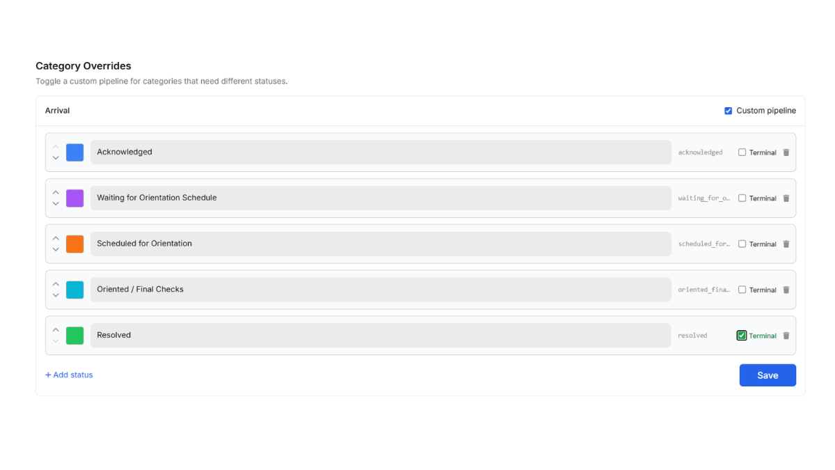 Optionally, you can toggle a custom pipeline for categories that need different statuses than the default one. Simply tick the **Custom Outline** and customise the pipeline to suit your specific category.
