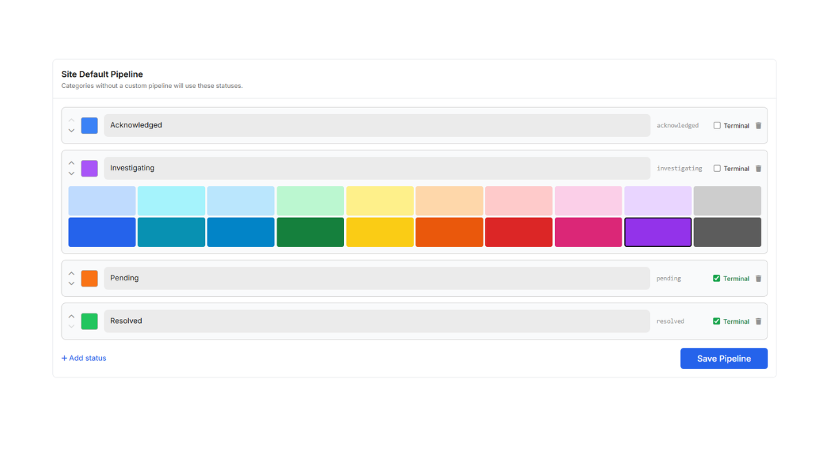 The first section you'll see is the status pipeline for default incidents. All incident categories without a custom pipeline will use this.\